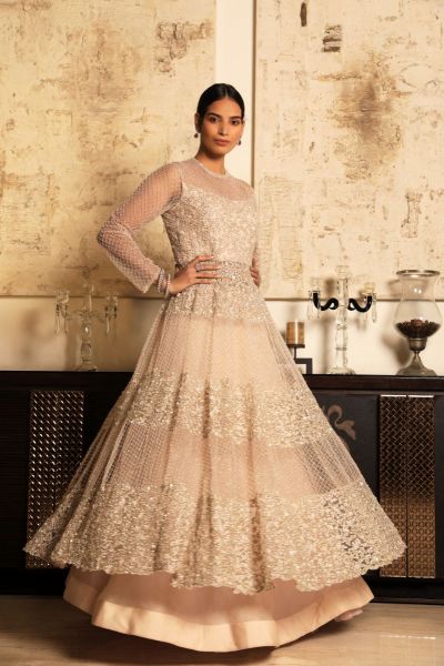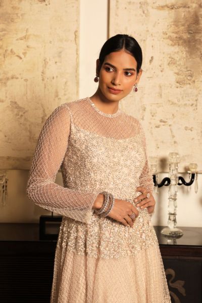 A peach jacket with heavy embroidery on an organza base is featured. It's matched with a skirt that's the same colour.