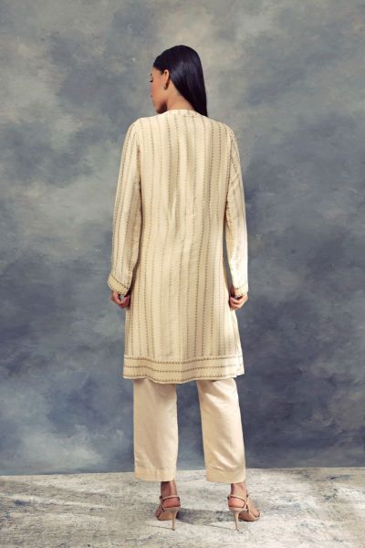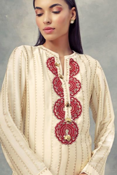 A light and statement-making festive look with this gold foil printed kurta featuring thread embroidery and coin tassels around the neckline, teamed with matching pants. Style the look with a potli bag.