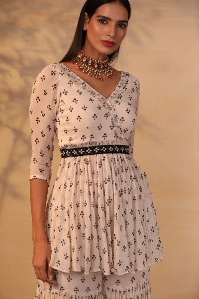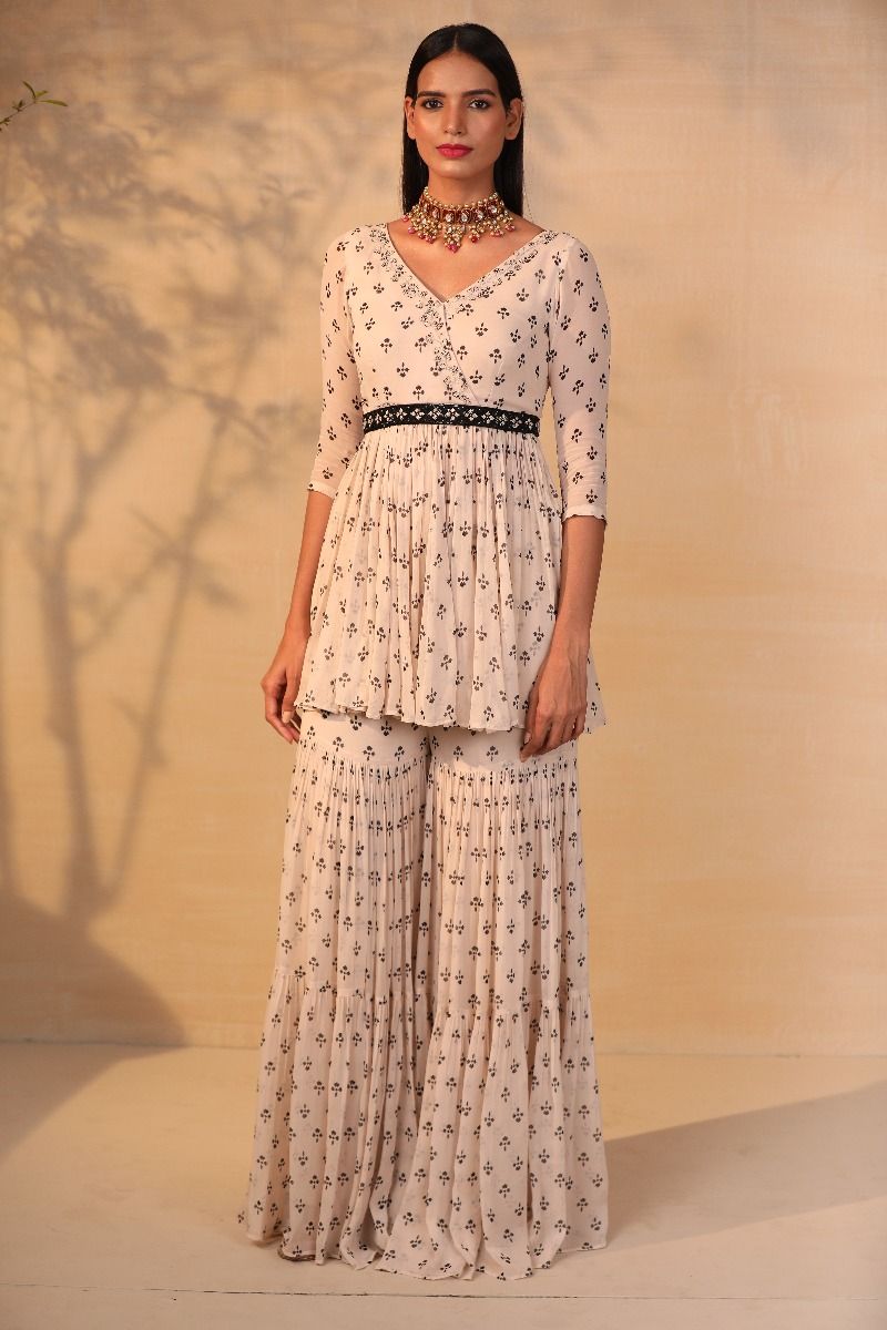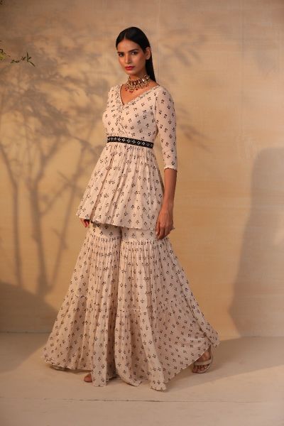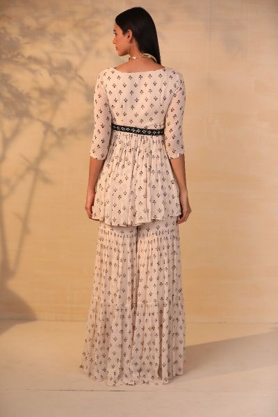 Off white kurta with floral printed motifs & embroidered neckline. Paired with gharara & belt.