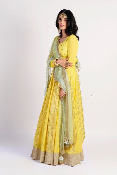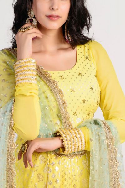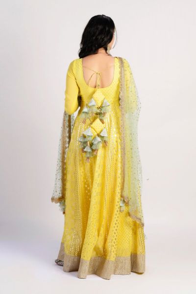 Yellow anarkali with all-over woven gold-tone motifs, placement cutdana work & embroidered cuffs. Paired with contrast lace border embellished dupatta.