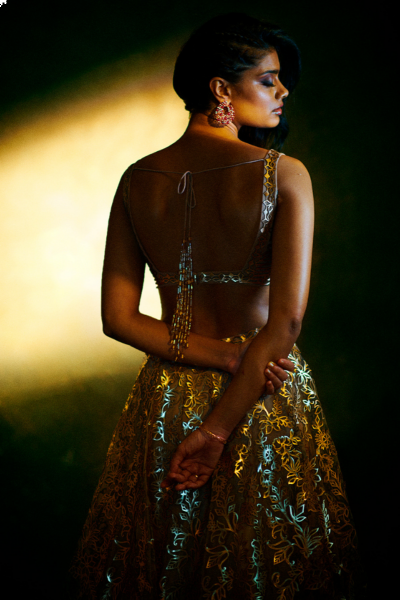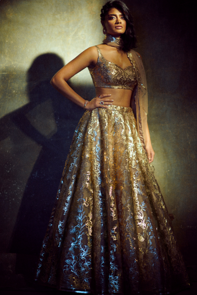 This lehenga collection comes with a net embroidered dupatta and features all over metallic cut work.