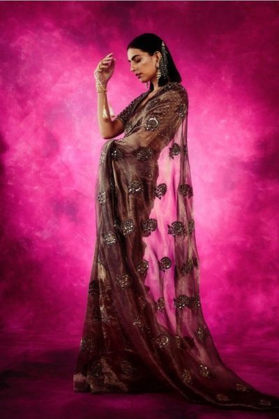 This exquisite tissue sari features Mughal buttis applique work in nalki, zari, and cutdana, and is paired with an embellished deep V-neck blouse by Vvani by Vani Vats. Add a clutch and statement earrings to complete the look.