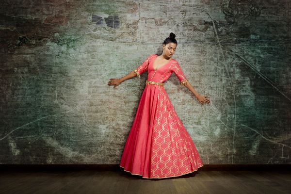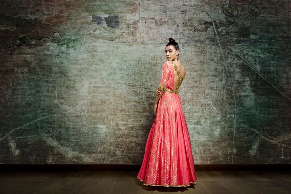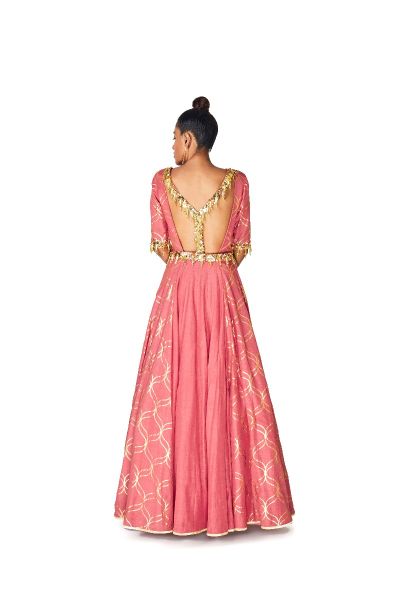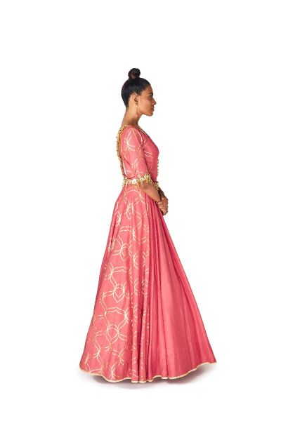 Featuring a coral pink anarkali gown in linen silk base with foil printing, embellished using sequins and cutdana with salli tassel detailing.