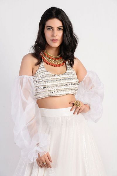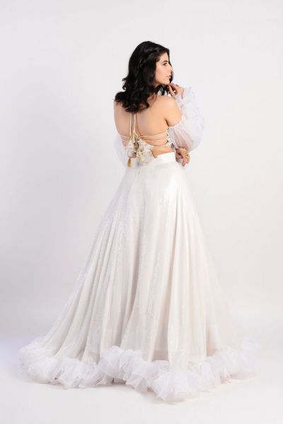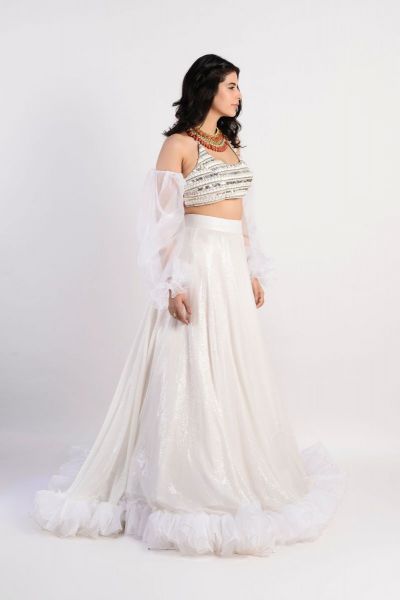 Pearl white lehenga with sequin texture & frill hem. Comes with halter backless blouse enhanced with bead work & detachable sheer sleeves.