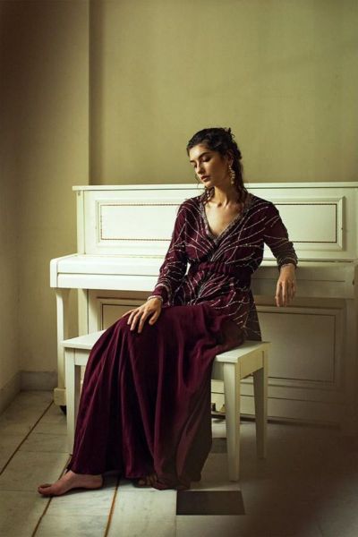 A beautiful deep marshal pepulum top with drape skirt.Perfect for those women who love to slay it fashionably even while donning the most traditional Indian attire.