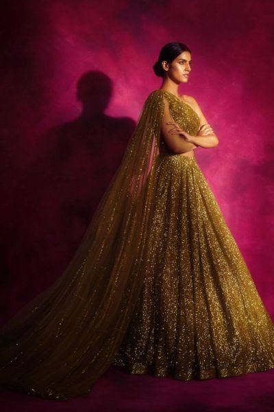 This glamorous sequin embellished lehenga is designed by Vvani by Vani Vats and features a one-shoulder blouse with a floor-grazing veil on one side. Wear emerald danglers and a bracelet to complete the look.