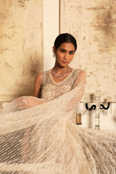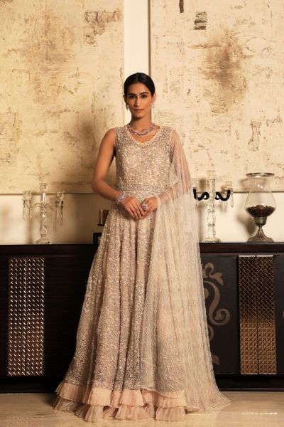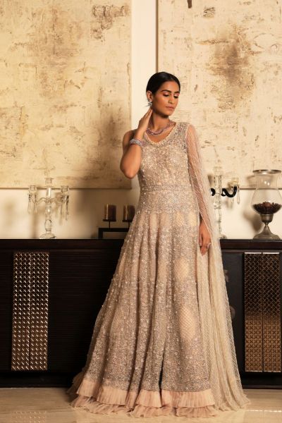 A dusty pink lehenga with strong embroidery on a net frame. It's matched with a trail dupatta and a matching blouse.