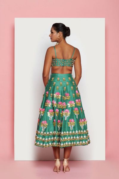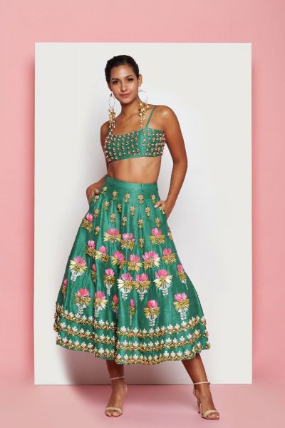 An emerald green raw silk short lehenga embellished with lotus motifs of pop pink shells and gold charms. Paired with a matching gold and beads embellished bustier.