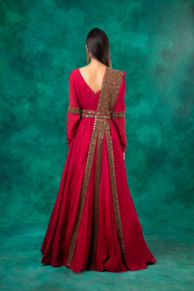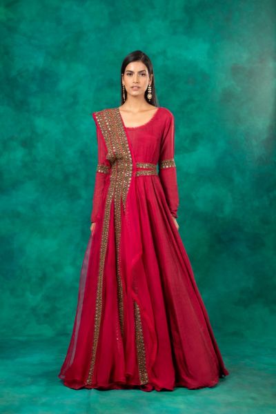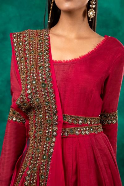 Fuchsia banjaaran silk embroidered anarkali paired up with pre- draped embellished organza dupatta.