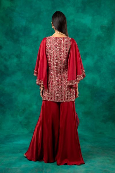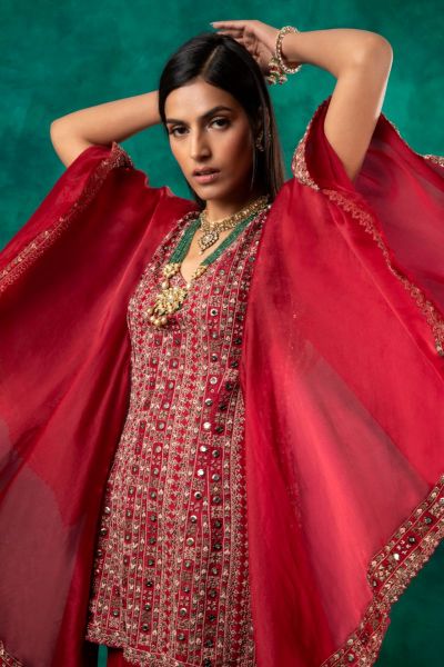 Fuchsia flouncy peplum escalated with added lightness of translucent dupatta and cord detailing on sharara.