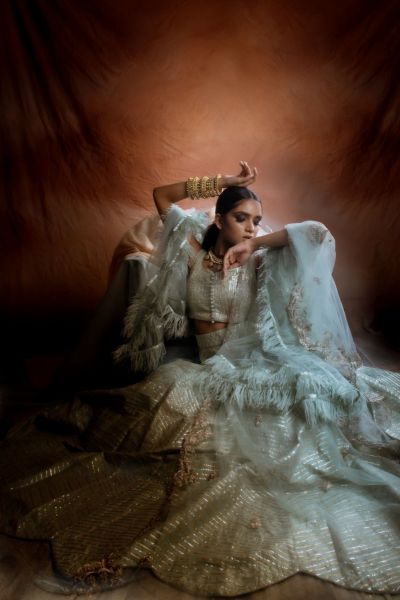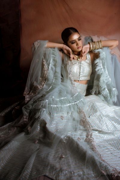 Glacial Green Gota Patti Embriodered lehenga raw silk fabric with gota work, raw silk blouse and a duppata havong dori work.