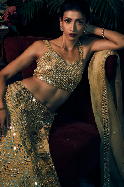 The highlighting feature of this lehenga is its mirror work.It is a dazaling gold lehenga and when paired with the organza duppata completes the set.