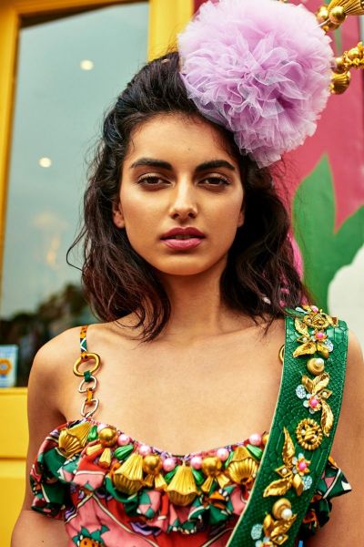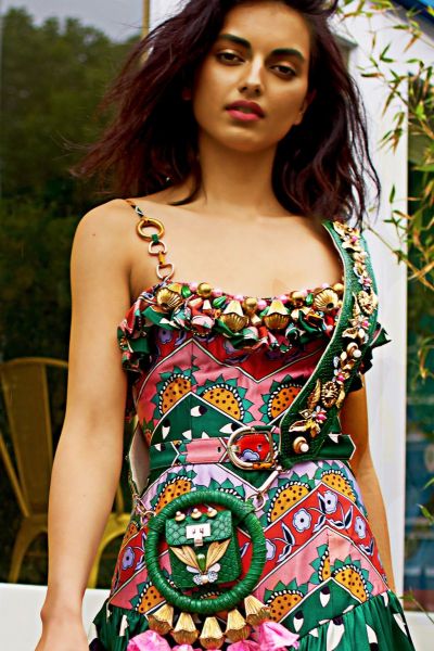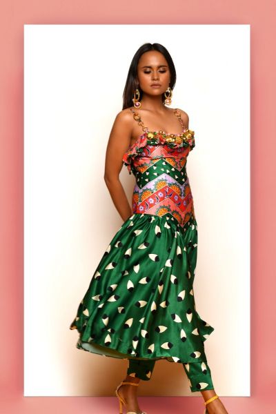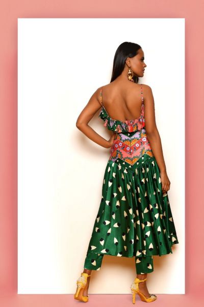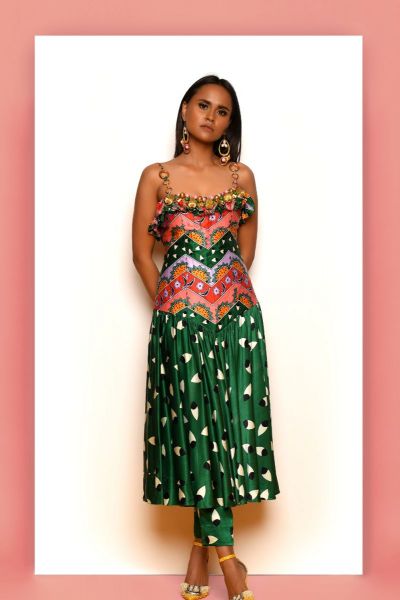 Chevron and madhubani eyes printed drop waist dress worn over printed cigarette ankle length pants.