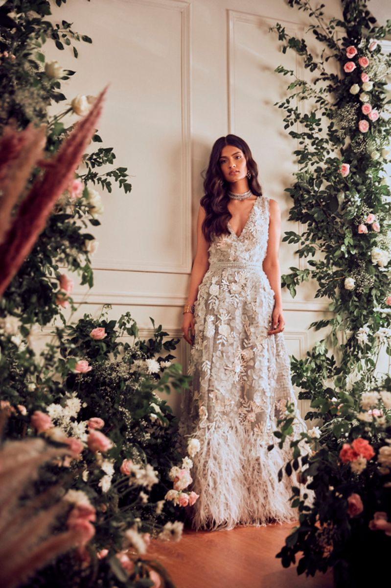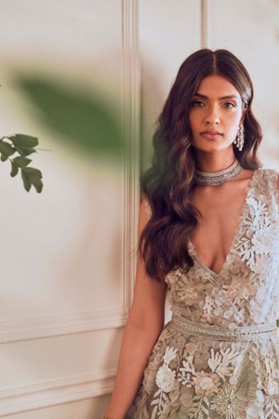 Not So Serious by Pallavi Mohan gives a dreamy and eye-pleasing look to this gown with feather fringe detailing and laser applique work featuring fine bugle beads, sequin and rhinestone embellishments