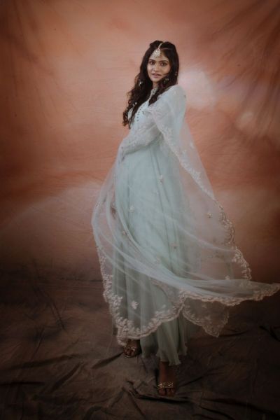 Himalayan Mint Green Anarkali Georgette Anarkali and net Dupatta with Dori Work embriodery.