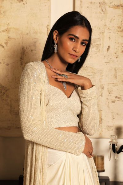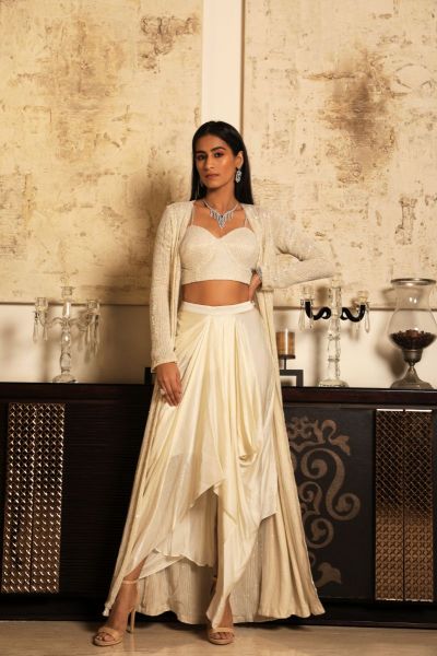 The jacket is ivory with a satin base and sequin embroidery. It's worn with a dhoti skirt and a matching bustier.