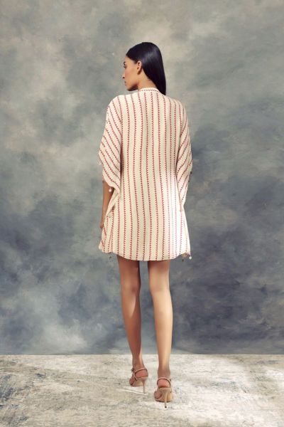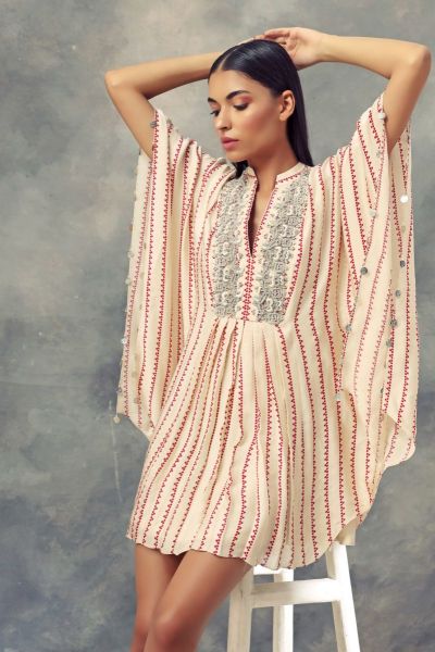 Featuring an ivory & red nukta print short kaftan dress with thread & pearl embroidered neckline & sikka finishing.