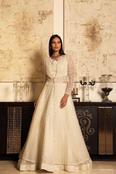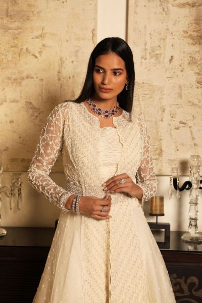An ivory jacket with pearl embroidery on an organza base is featured. It comes with a lehenga and a matching inner.