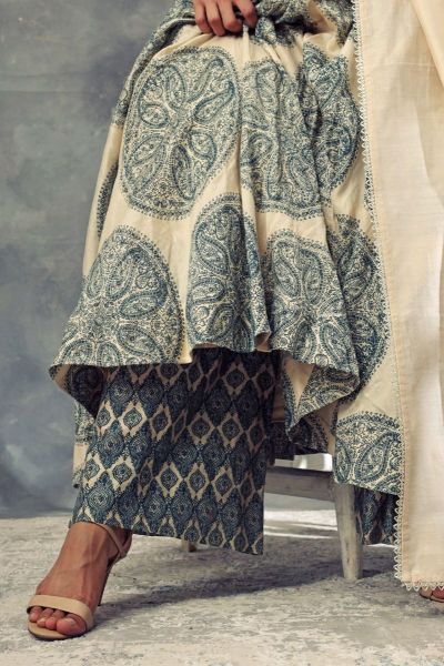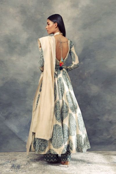 Timeless and trendy festive look with this butti printed chanderi anarkali featuring thread and kasab embroidery, teamed with moroccan printed pants, ivory dupatta and printed belt. Style the look with a pair of polki earrings .