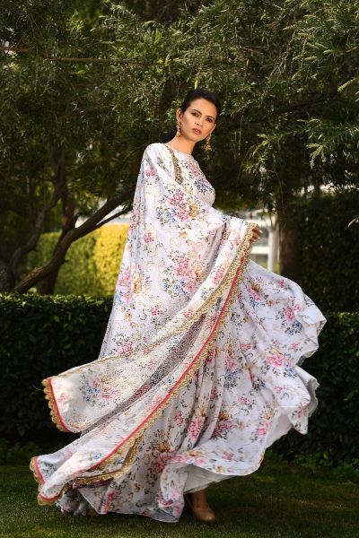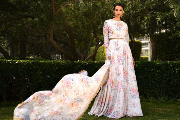 Ivory printed lehnga with highlighted lehnga body and cut out back. Comes with a georgette printed flared skirt. Chiffon printed highlighted dupatta finished with pearl embelished gota completes the set.