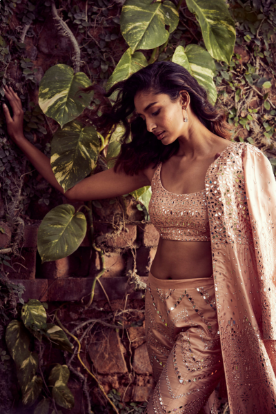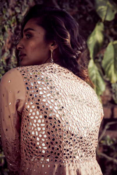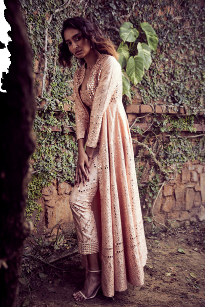 The highlighting feature of this pant set is its mirror work. Its a blush pink pant set and is paired with a full length jacket.