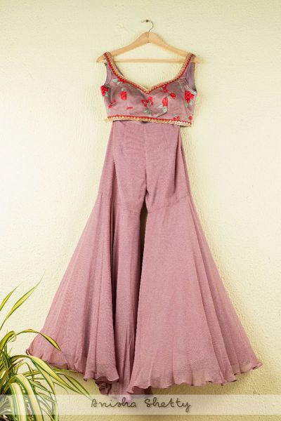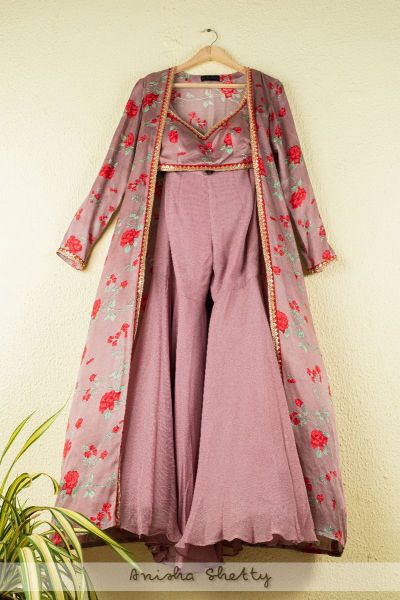 ONION PINK FLORAL CROP TOP WITH JACKET & SHARARA PANTS