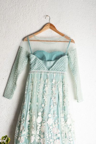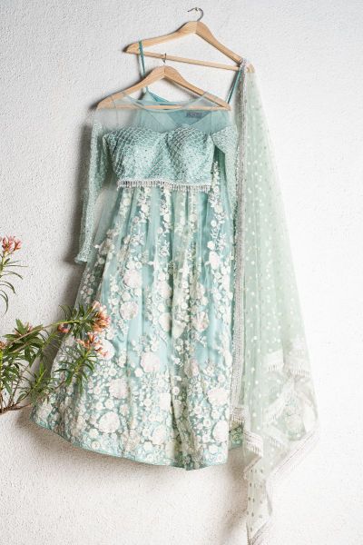 LIGHT TEAL BLUE BLOUSE WITH LIGHT TEAL BLUE & OFFWHITE THREADWORK LEHENGA SET