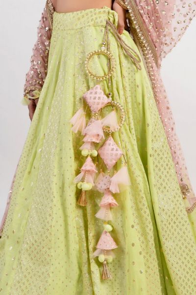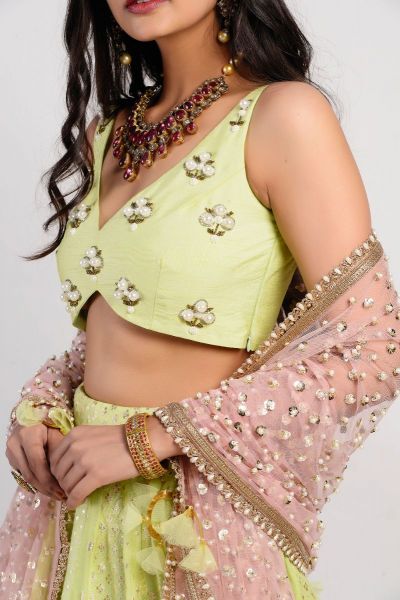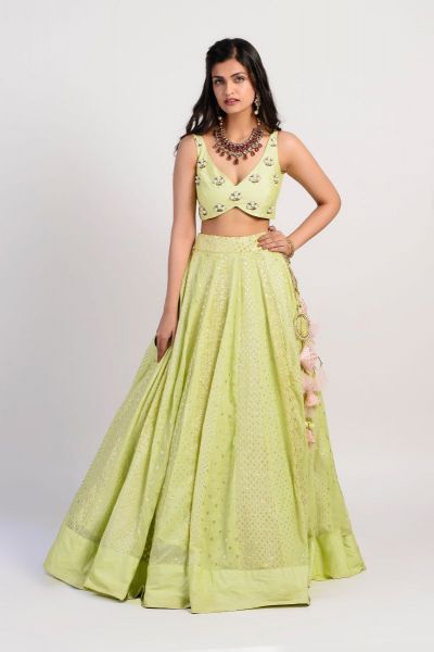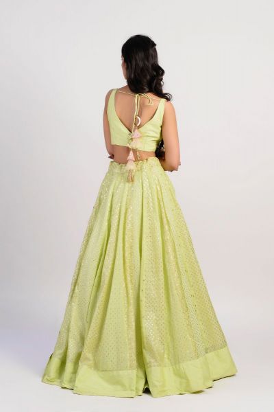 Lime green panelled lehenga with all-over gold-tone motifs. Comes with floral bead embellished blouse & contrast pearl embroidered dupatta.