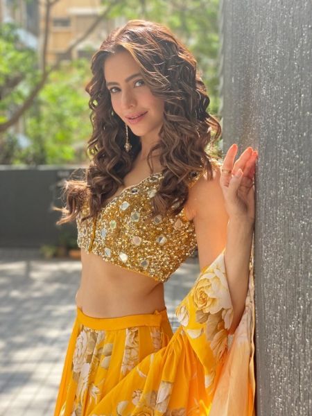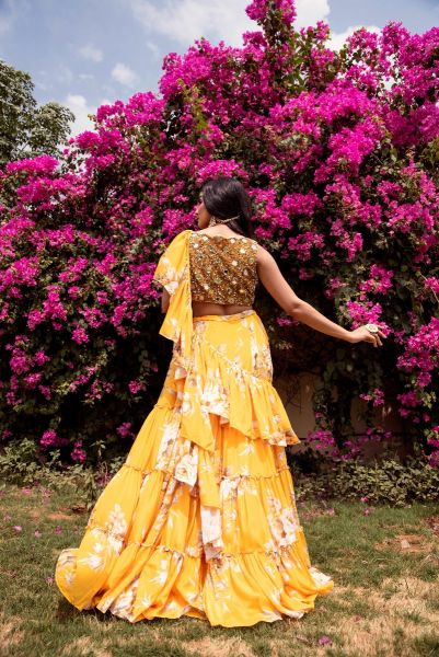 Crepe yellow mango printed layered sari lehnga with ruffle pallu. Comes with a sequins and mirror hand embroided plunge neckline blouse.