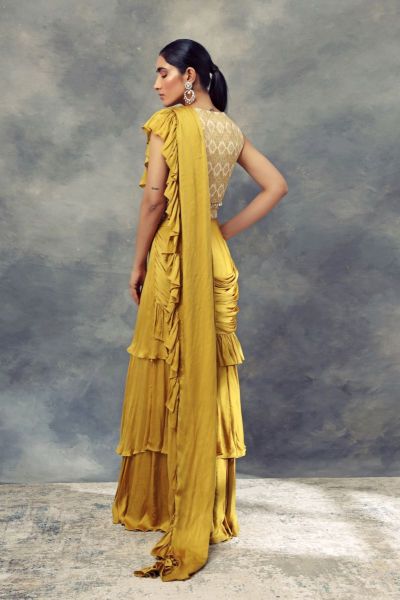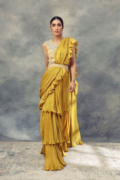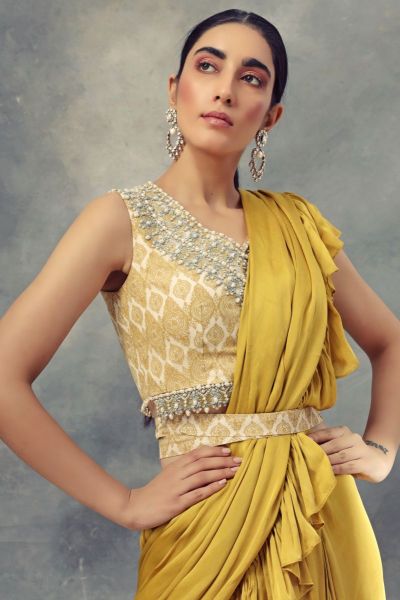 Layered sari with ruffle accents and moroccan printed blouse featuring pearl & kasab embroidery, cinched with a waist belt. Style the look with a pair of chandelier earrings.