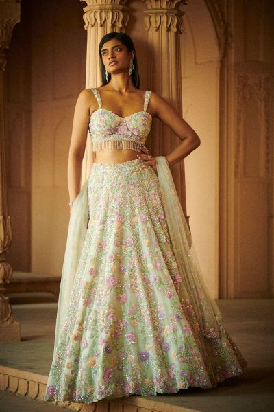 This aquamarine lehenga set features three-dimensional embroidery and embellished flowers. The skirt is paired with a balconette blouse and an embroidered net dupatta.