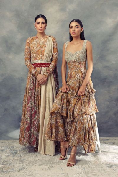 Kalidar anarkali with jaal print, featuring print and embroidery on the dupatta, teamed with a handcrafted thread embroidered and pearl-accented scallop belt. Style the look with an embroidered potli bag.