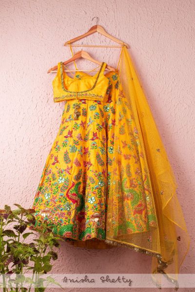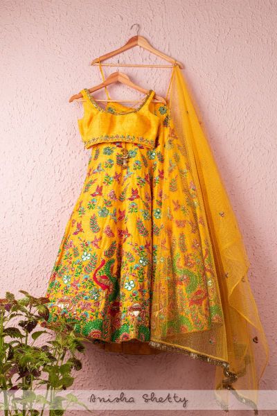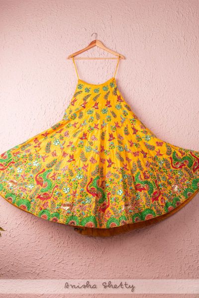Mustard Yellow Lehenga hand embellished with the most beautiful embroidery in floral pattern accentuated with flamingos,butterflies and humming birds in delicate resham work, leather work and zardosi.