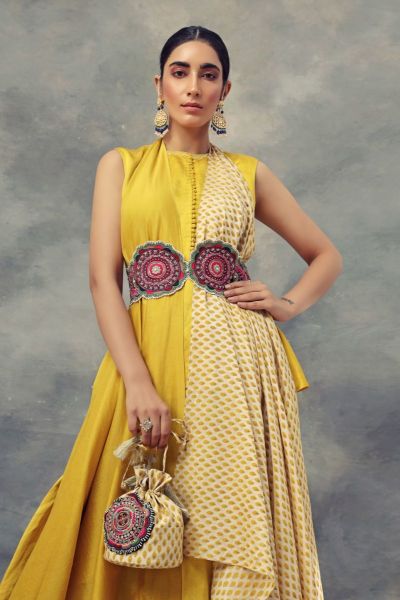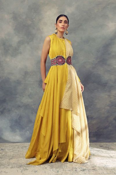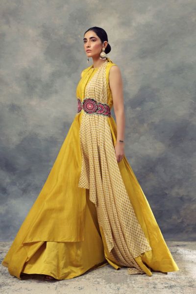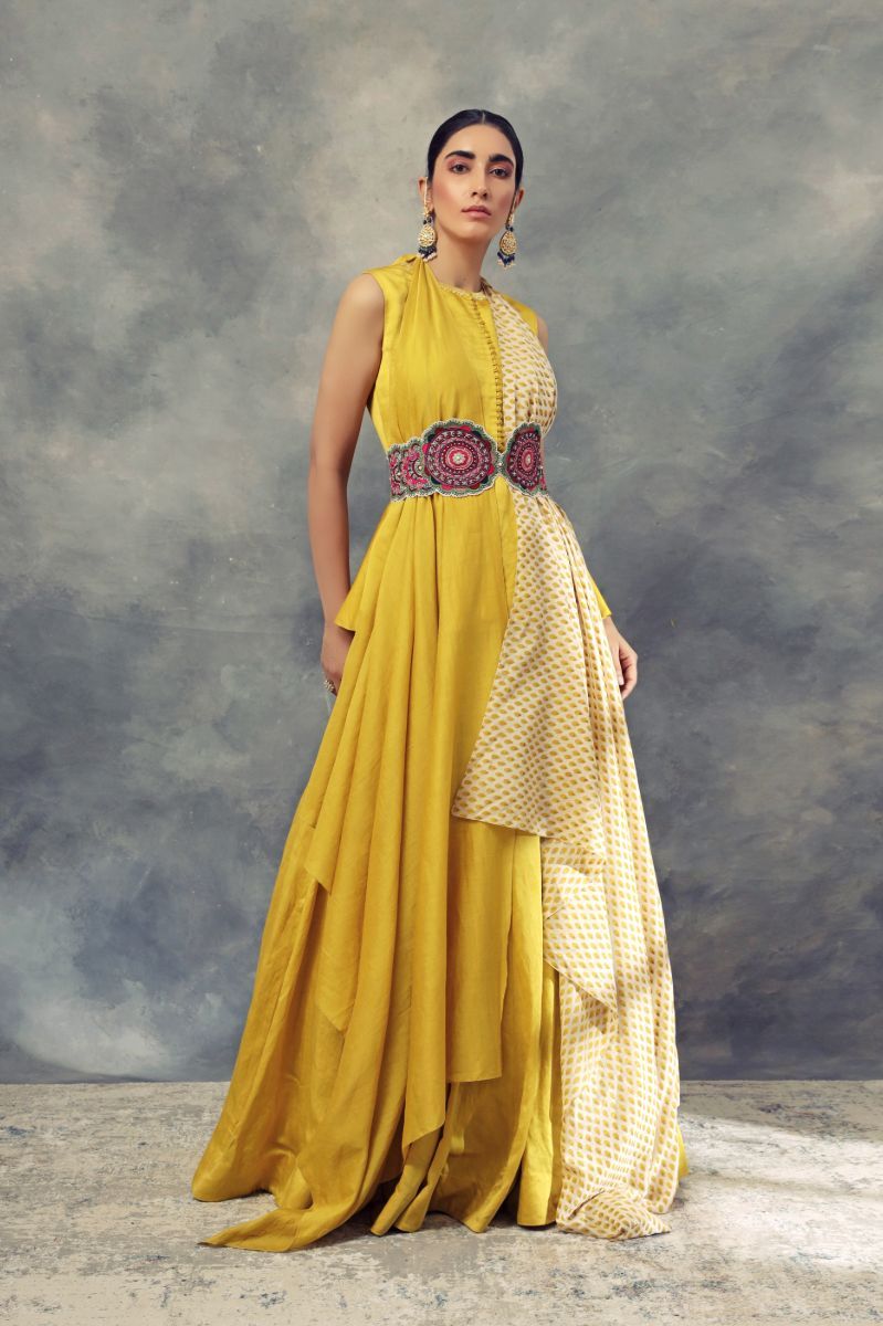 This peplum top and skirt with layered flare, teamed with a printed dupatta and multicoloured embroidered belt. Style the look with statement earrings and a stackable bangles.