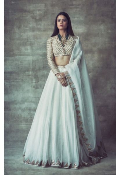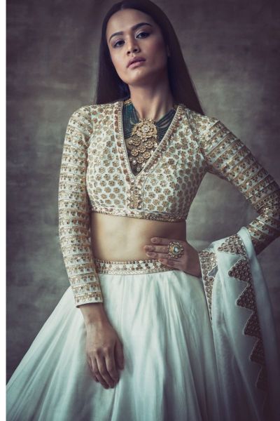 Hand Embroidered with sequin & thread V neck blouse with silk organza skirt and dupatta with real mirror borders.
