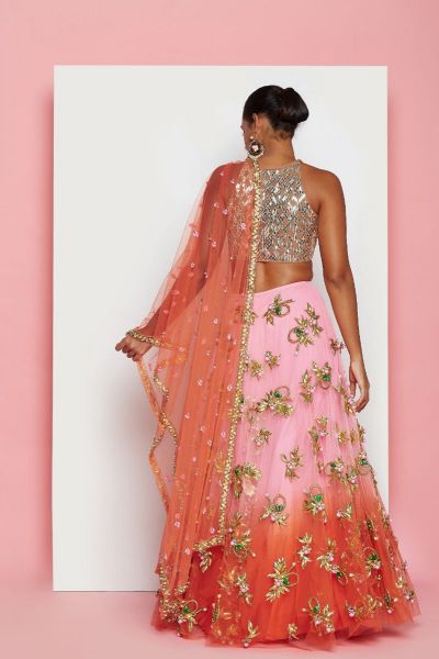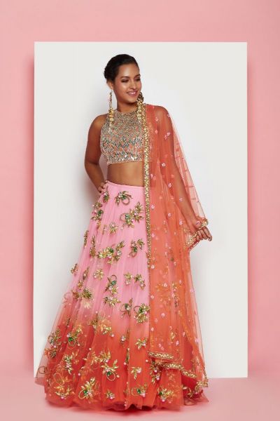 A pink to orange dip-dyed tulle lehenga embroidered with gold rings, leafs, sequins and colorful beads paired with a nude halter neck snake skin sequin embellished blouse and a matching dupatta.