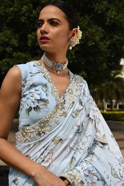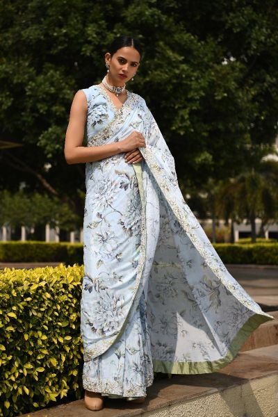 Pale blue printed sari with hand embroided zardozi and pearl borders finished with sage green raw silk. Comes with a plunge neckline printed blouse embroided on the neckline. Shanton peticoat completes the set.