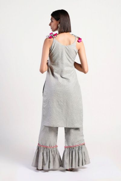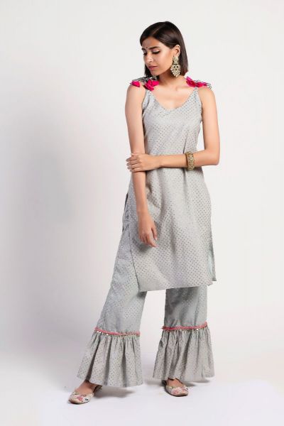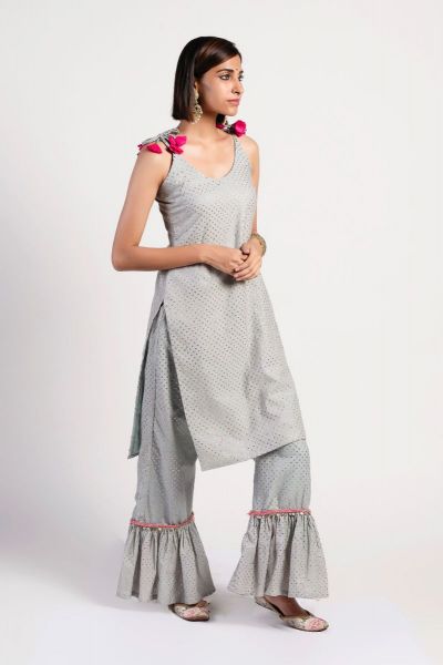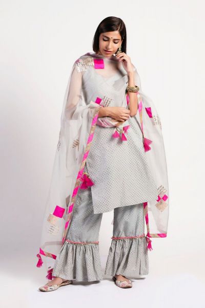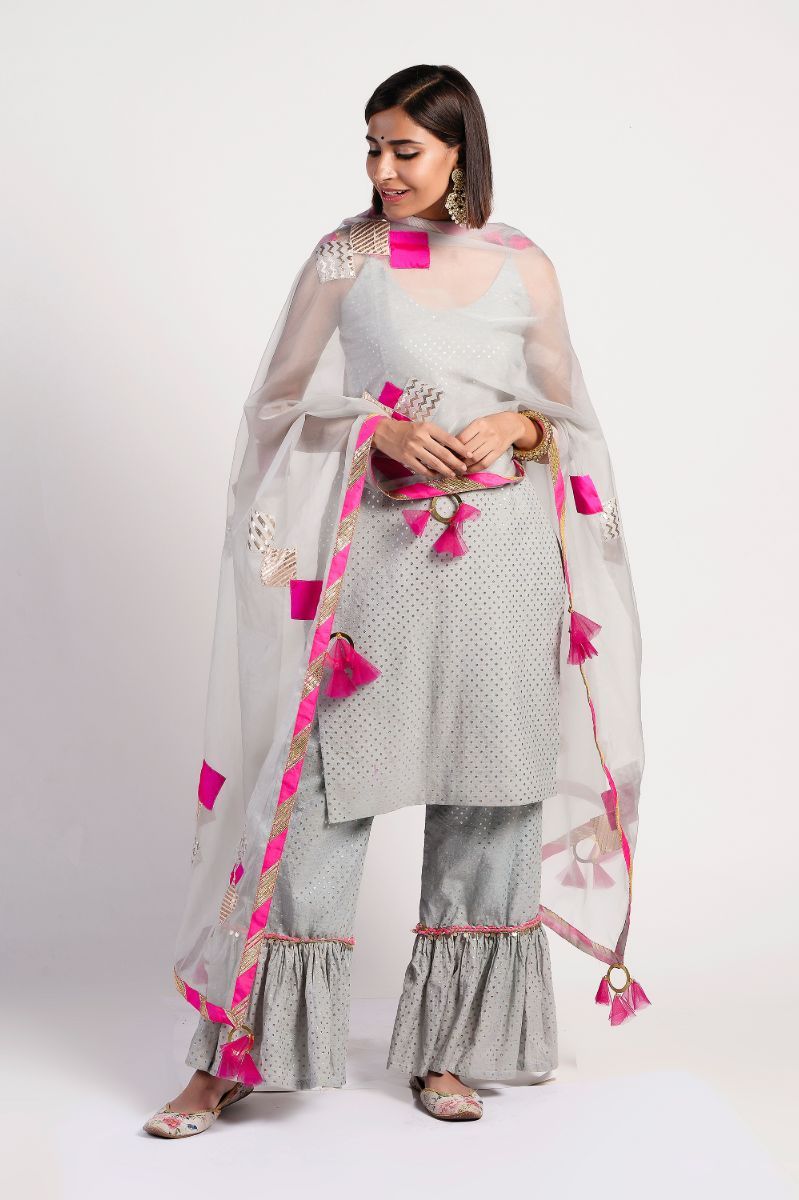 Featuring a modern play of a subtle pastel grey kurta and pants enhanced with appliqued and tassel dupatta
