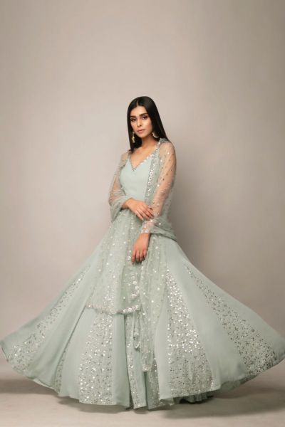 Refreshing mint anarkali with hand embroidered gore panel detailing paired with a delicate net dupatta with a cutwork edge.