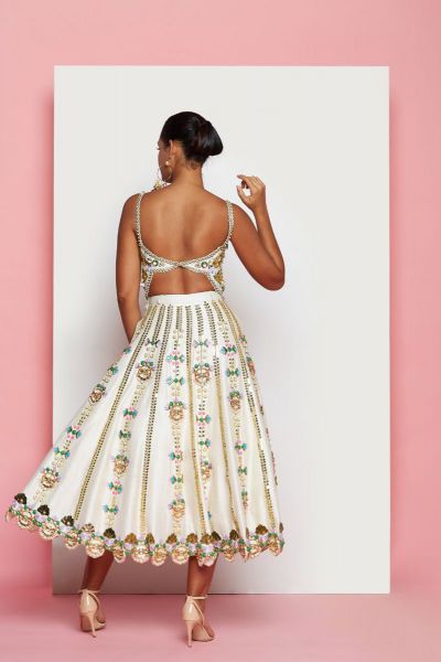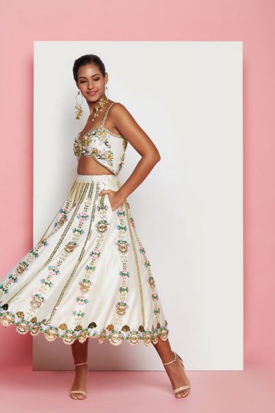 An ivory short lehenga with linear motif placement of 3D metallic embellishments paired with an ivory butterfly shaped blouse.