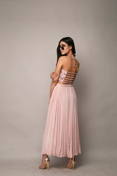 Edgy back detailing with fabric strips running across the back. Hand pleasted skirt. Crop top embellished with beads, sequins, mirrors and floral shaped material.