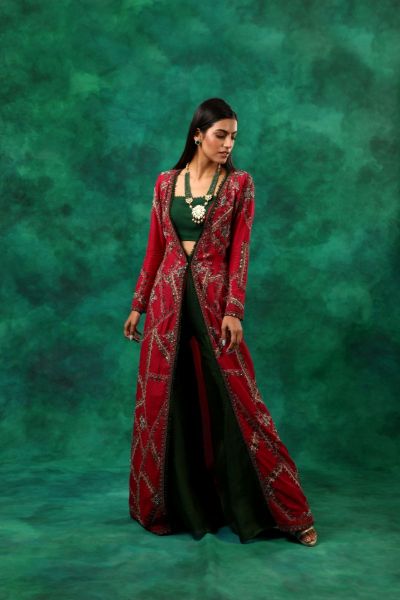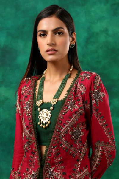 A pink jacket kurta in silk and organza with embroidery is featured. It's worn with sharara pants and a matching green bustier