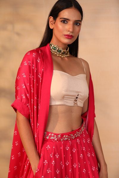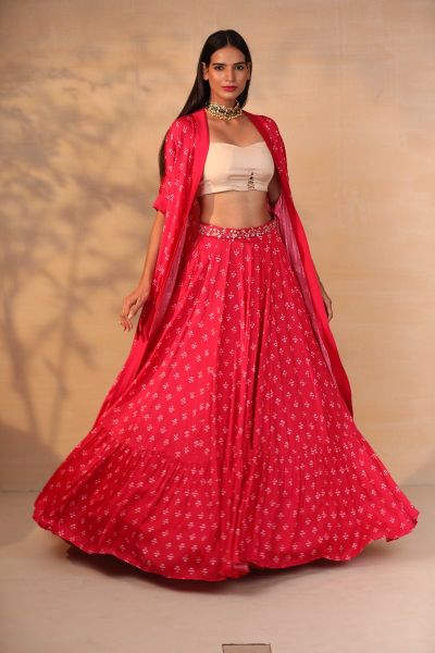 Hot pink cape with floral printed motifs paired with lehenga. Comes with bustier & belt.