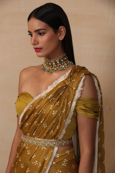 Mustard pre-stitched saree with floral printed motifs. Paired with embroidered frill blouse & embroidered belt.
