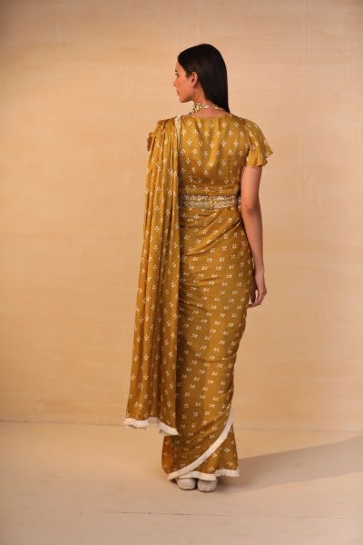 Mustard pre-stitched saree with floral printed motifs. Paired with embroidered frill blouse & embroidered belt.
