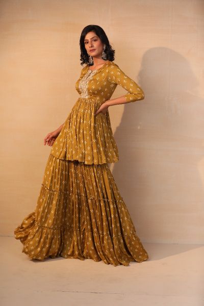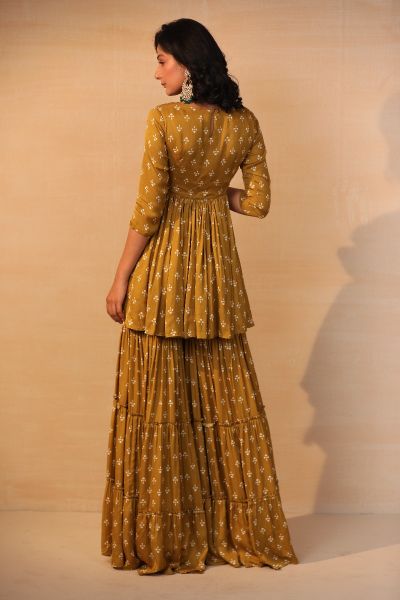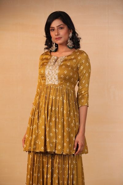 Mustard kurta with floral printed & embroidered detail. Paired with printed sharara.