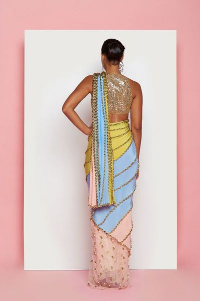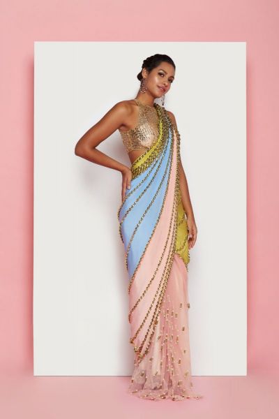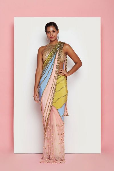 A Tri-colored pre-stitched saree paired with a gold snakeskin embroidered halter neck blouse.