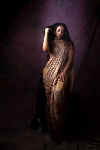 A Beautiful Shimmer maroon and gold Georgette saree with matching blouse perfect for evening events.