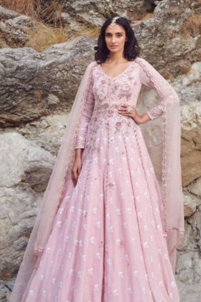 With an organza Dupatta, this powder pink silk chiffon Chikankari Kalidaar collection features Zardozi embroidery.