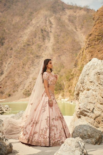 Raw Silk Bridal Lehenga in Powder Pink with Dori and Zardozi Embroidery. An embroidered Choli and two dupattas complete the look.